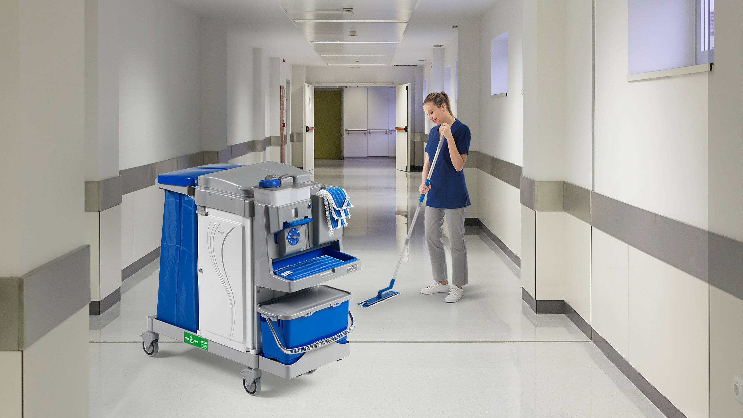 The wide range includes highly efficient dusting and mopping systems, innovative mop soaking systems, high-quality equipment for glass and surface cleaning, ergonomic wringer trolleys, extremely modular multipurpose trolleys, functional housekeeping trolleys, convenient plastic bag holders and a wide range of buckets and bins.
